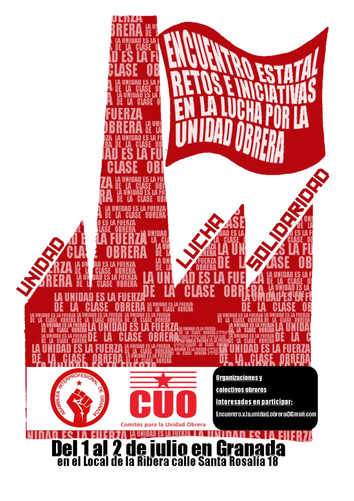 Desde diferentes colectivos asamblearios que desde hace años trabajamos por recuperar la iniciativa en el Movimiento Obrero desde la base y por la unidad obrera, vemos que los diferentes colectivos desarrollamos trabajos paralelos y que se podrían alimentar de las experiencias y luchas que se hayan podido conseguir en cada una de nuestros colectivos y asambleas, al igual la dificultades y los medios nos hacen que desde el tajo, centro de trabajo, huelga o colectivo de trabajadores las luchas y coordinaciones no pasen más allá de lo local y escasamente de una solidaridad mayor a través del conocimiento que se puedan dar sabiendo de ellas y ofreciendo solidaridad desde las redes. Es por ello que contando con varios colectivos que se ofrecen a ser anfitriones, en este caso la Asamblea Interprofesional de Granada (Local de la Ribera, calle Santa Rosalía 18, en el Zaidín (bus U3, SN2, SN4)), y con las dificultades de tiempo y distancia nos marcamos con tiempo una fecha fija por aquello de ir reservando viajes y días para las organizaciones que sean más lejanas interesadas en acudir a este Encuentro.